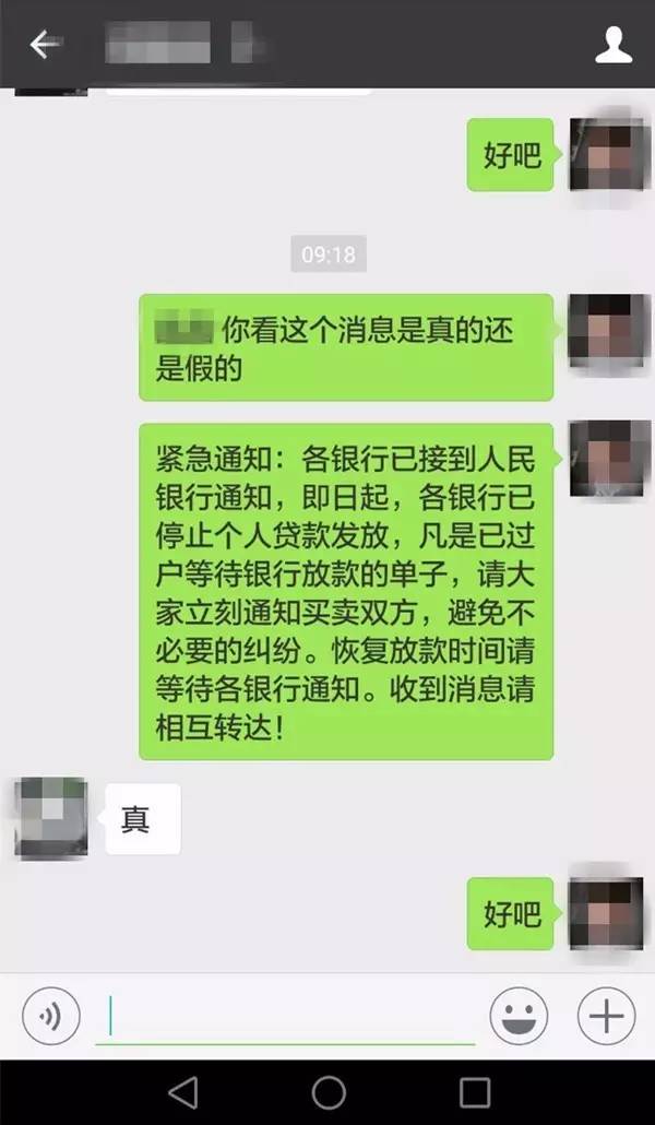 “紧急通知:各银行已接到人民银行通知,即日起,各银行已停止个人贷款发放,凡是已过户等待银行放款的单子,请大家立刻通知买卖双方,避免不必要的纠纷。恢复放款时间请等待各银行通知。收到消息请相互转达!”