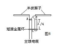 半波振子的一臂与主馈线中的A点),另一臂与λ/4导体上端和同轴电缆的内导体相连接(图6中的B点),λ/4导体的下端则通过短接金属环与主馈线中的C点)。那么A--》B点之间的距离为λ/2,所以,B点的信号送到A点时刚好反相,这样一来就把同轴线的不对称变为对称了。从A、B两点向短接金属环看进去是一段λ/4的短路线,其阻抗为无穷大,所以对阻抗匹配不会造成影响。