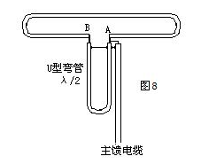 λ/2平衡变换器又叫U型平衡变换器,如图8所示,折合半波振子天线欧的同轴线连接时,二者阻抗不匹配,因此必须在它们之间加装U型平衡变换器。从图8可看出,馈电点A和B的对地阻抗为300/2=150欧,信号从主馈电缆传至A点分成两路,分别供给振子左右两边的负载。由于A、B两馈电点的波程差为λ/2。因此,A、B两馈电点的电源大小相等,方向相反,从而达到了平衡变换的目的。